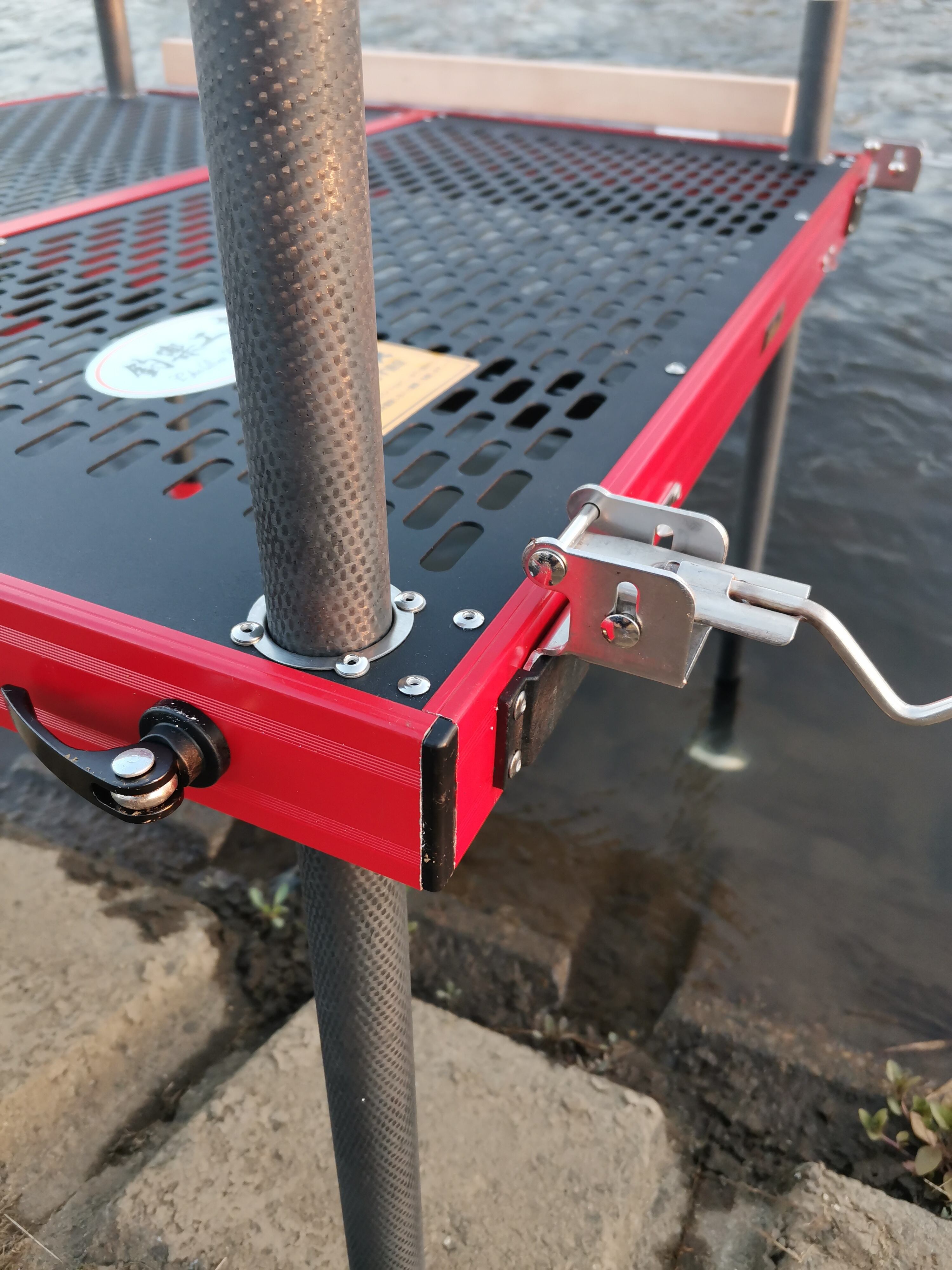 新モデル、釣楽工房製アルミ釣台LK-8080サイズ80cm×80cm、天板アルミ製パンチング軽量モデル、4本スライド足、足材質はカーボン製