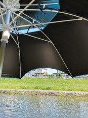 パラソル裏側の塗装、①黒色塗装遮光性1級、日差しが透けません、②シルバー色塗装遮光性2級、少し日差しが透ける。